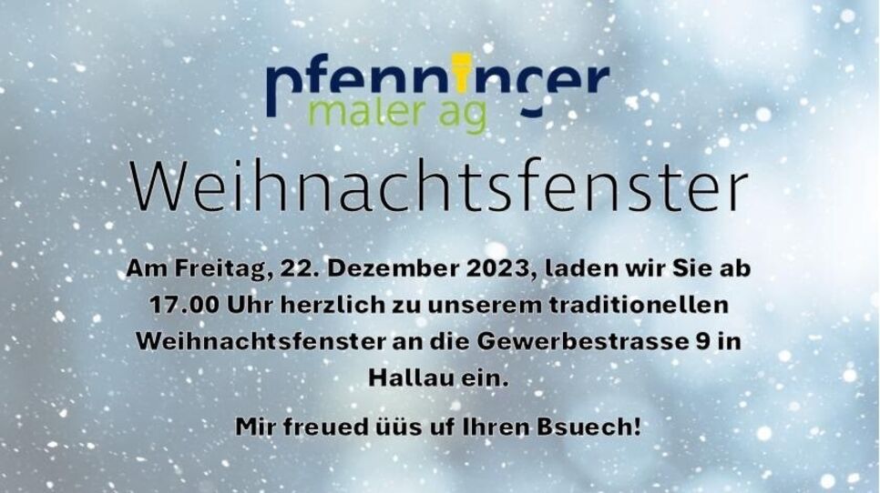 Im "ondere Bronne" von heute ist erwähnt, dass das Weihnachtsfenster der Pfenninger Maler AG am Sonntag, 17. Dezember stattfindet. Das ist nicht korrekt - der Anlass findet erst am Freitag, 22. Dezember, ab 17 Uhr statt. Wir entschuldigen uns für diesen Fehler und bitten um Verständnis. (kbo)