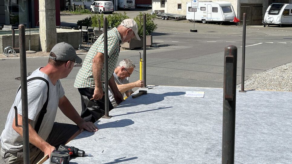 In der grossen Sommerhitze an einem der letzten Wochenenden erstellten in Wilchingen Roland Külling und Christoph Gysel gemeinsam mit zahlreichen Helfern und Holz aus der Hedinger Sägerei AG die beiden Podien für die Freilichtspiele «Wilchinger Handel». (ju)